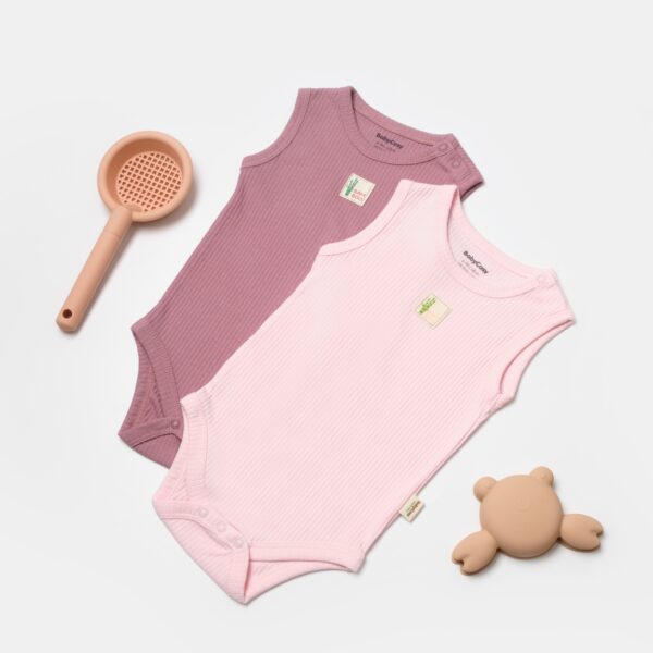 Το σετ περιλαμβάνει δύο αμάνικα κορμάκια. Το πρώτο ξεχωρίζει με απαλό ροζ χρώμα και το δεύτερο με λιλά απόχρωση. Και τα δύο διαθέτουν κουμπάκια στο κάτω μέρος, ώστε να διευκολύνουν την αλλαγή πάνας. Οι καθαρές γραμμές τους επιτρέπουν στους γονείς να τα συνδυάζουν εύκολα με παντελονάκια, φορμάκια ή ζακετούλες. Έτσι, το μωρό παραμένει πάντα άνετο και καλοντυμένο.
