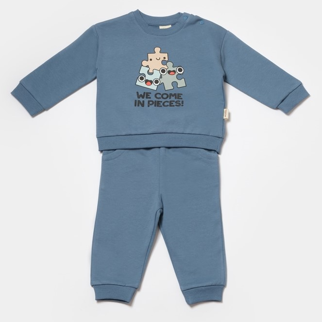 Το βρεφικό σετ οργανικό βαμβάκι 2 τεμαχίων μπλε προσφέρει άνεση, στυλ και παιχνιδιάρικη διάθεση στο μωρό σας. Σχεδιάσαμε το σετ με μπλούζα μακρυμάνικη που έχει στάμπα puzzle και το μήνυμα “We come in pieces!”. Συνδυάσαμε τη μπλούζα με παντελόνι στο ίδιο χρώμα και δημιουργήσαμε ένα κομψό και πρακτικό outfit που ξεχωρίζει.